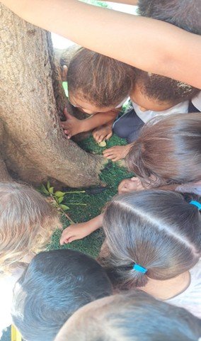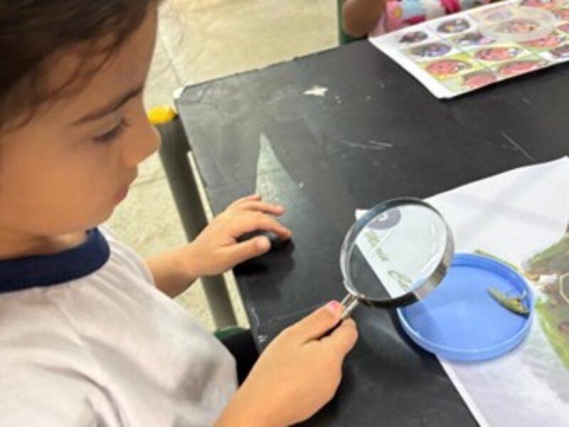 A iniciativa começou quando os pequenos, durante as brincadeiras nos espaços externos, passaram a observar formigas, joaninhas e outros insetos. Para organizar suas descobertas, criaram o “cantinho da natureza”, equipado com potes de observação, lupas, imagens e registros. Esse espaço se tornou ponto de encontro para experiências, perguntas e trocas de ideias.