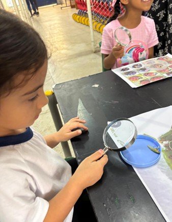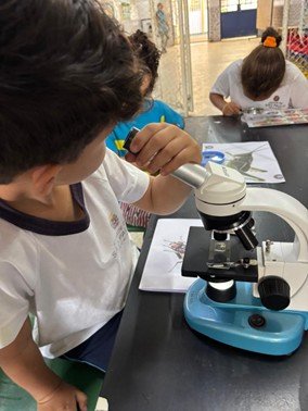 Um momento marcante ocorreu quando encontraram um pequeno casulo no pátio da escola. A partir dele, mergulharam no estudo do ciclo de vida das borboletas. Utilizando microscópios, insetos desidratados e exemplares em resina, as crianças puderam explorar de perto as diferentes estruturas dos seres vivos. O encantamento foi geral, e até funcionários da escola, pela primeira vez, experimentaram a observação com microscópios.