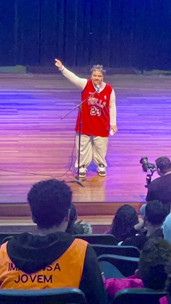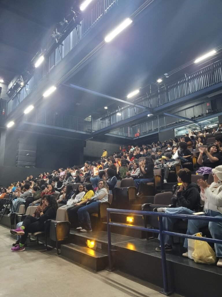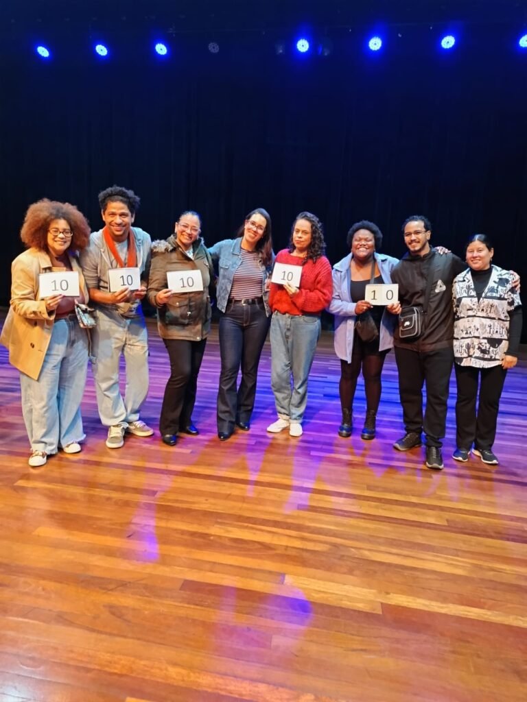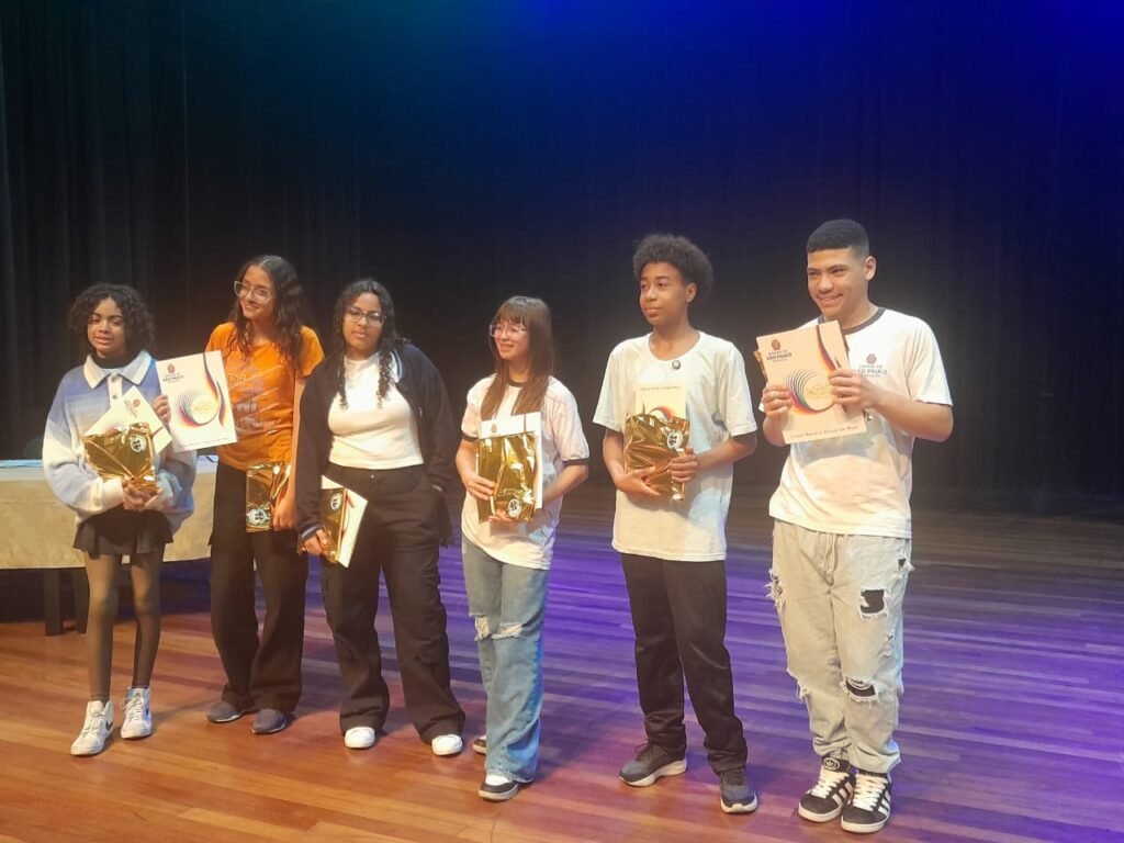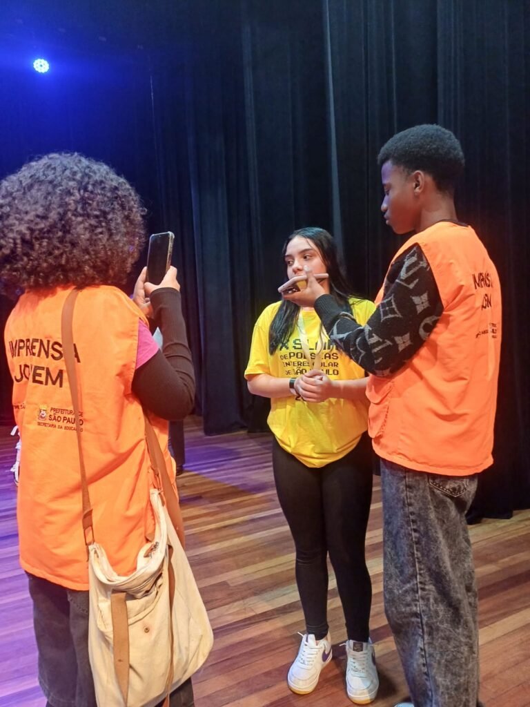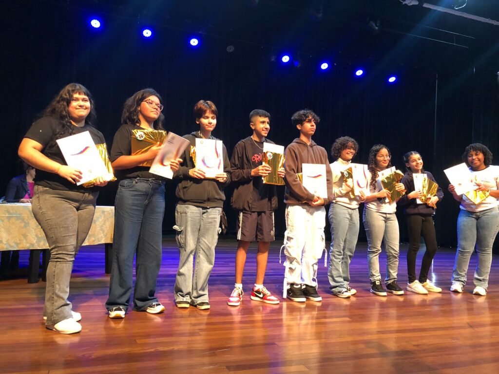 No dia 10/10, o teatro do CEU Vila Curuçá recebeu cerca de 300 estudantes, de 20 EMEF/EMEFM da região, para uma vivência que valoriza as vozes juvenis e a autoria. Os/as estudantes demonstraram com suas produções autorais, que estão afiados/as na escrita poética, nas performances e, sobretudo, estão atentos/as ao que se passa na sociedade. Uma equipe de comunicação de SME, assim como, as imprensas jovens das EMEF José Mario Pires Azanha e João Augusto Breves cobriram o evento.