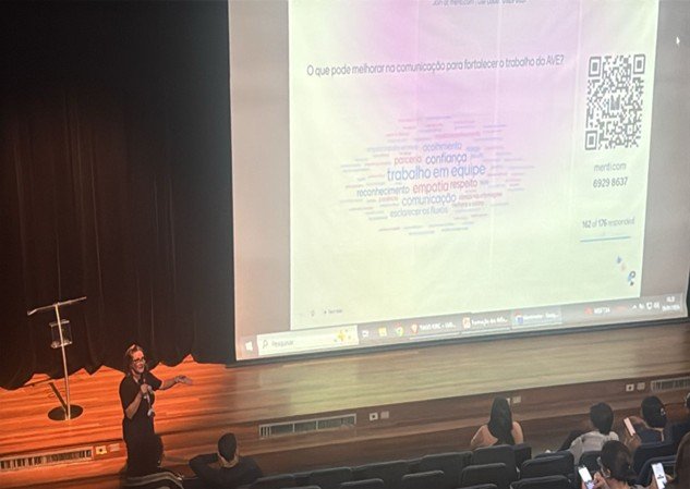 Dando continuidade à programação, foram abordados o fazer pedagógico e a importância da atuação dos profissionais da Educação Especial, com ênfase no papel da Auxiliar de Vida Escolar (AVE). A atividade contou com uma proposta interativa por meio da ferramenta Mentimeter, a partir de questões sobre os desafios enfrentados pelas AVEs no contexto escolar e estratégias para o fortalecimento da comunicação no ambiente de trabalho. As contribuições dos participantes subsidiaram uma abordagem dialogada sobre atribuições, funções, limites e atuação ética da AVE, com foco na promoção da autonomia dos estudantes, na participação ativa no cotidiano escolar e no trabalho colaborativo com as equipes das unidades educacionais.